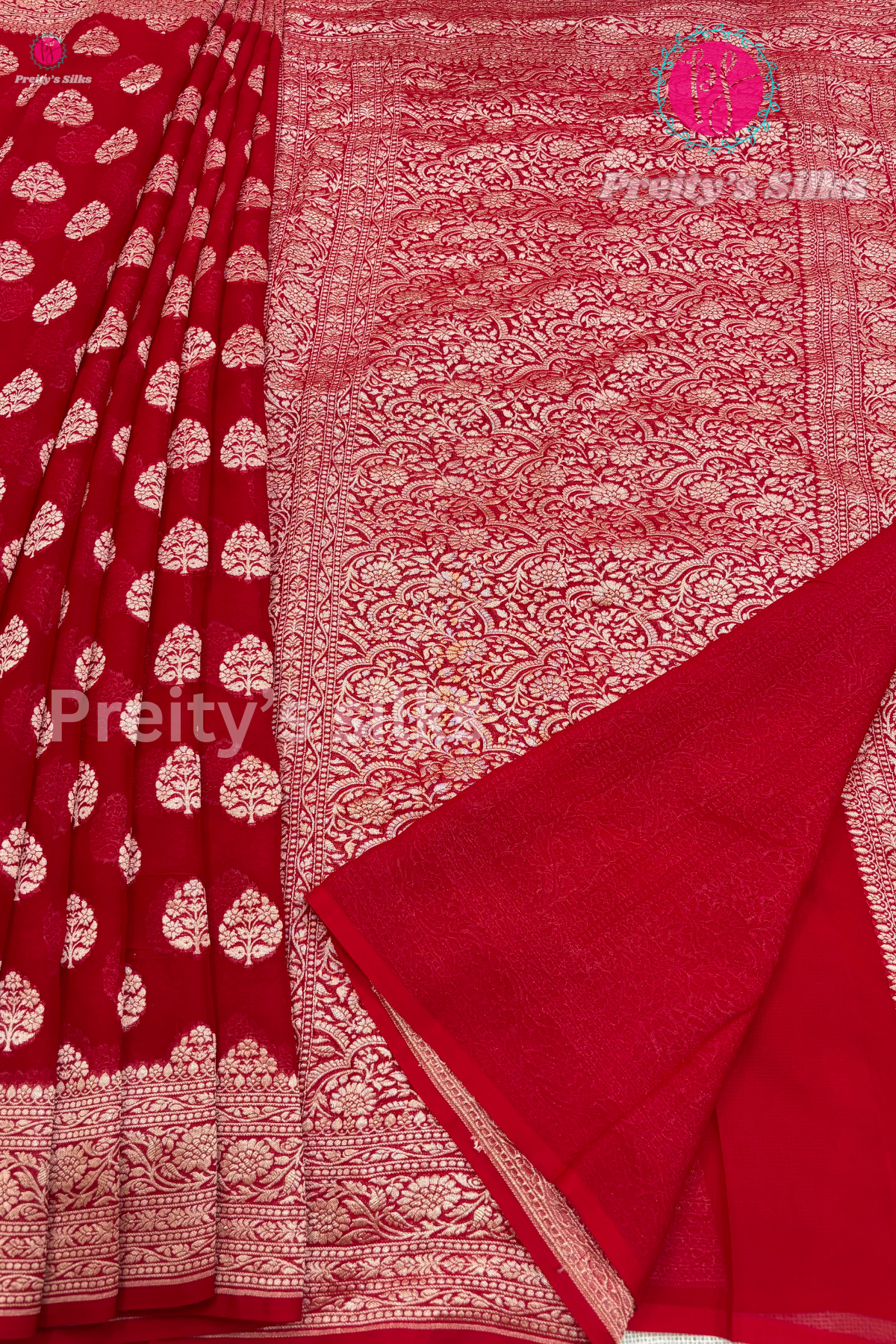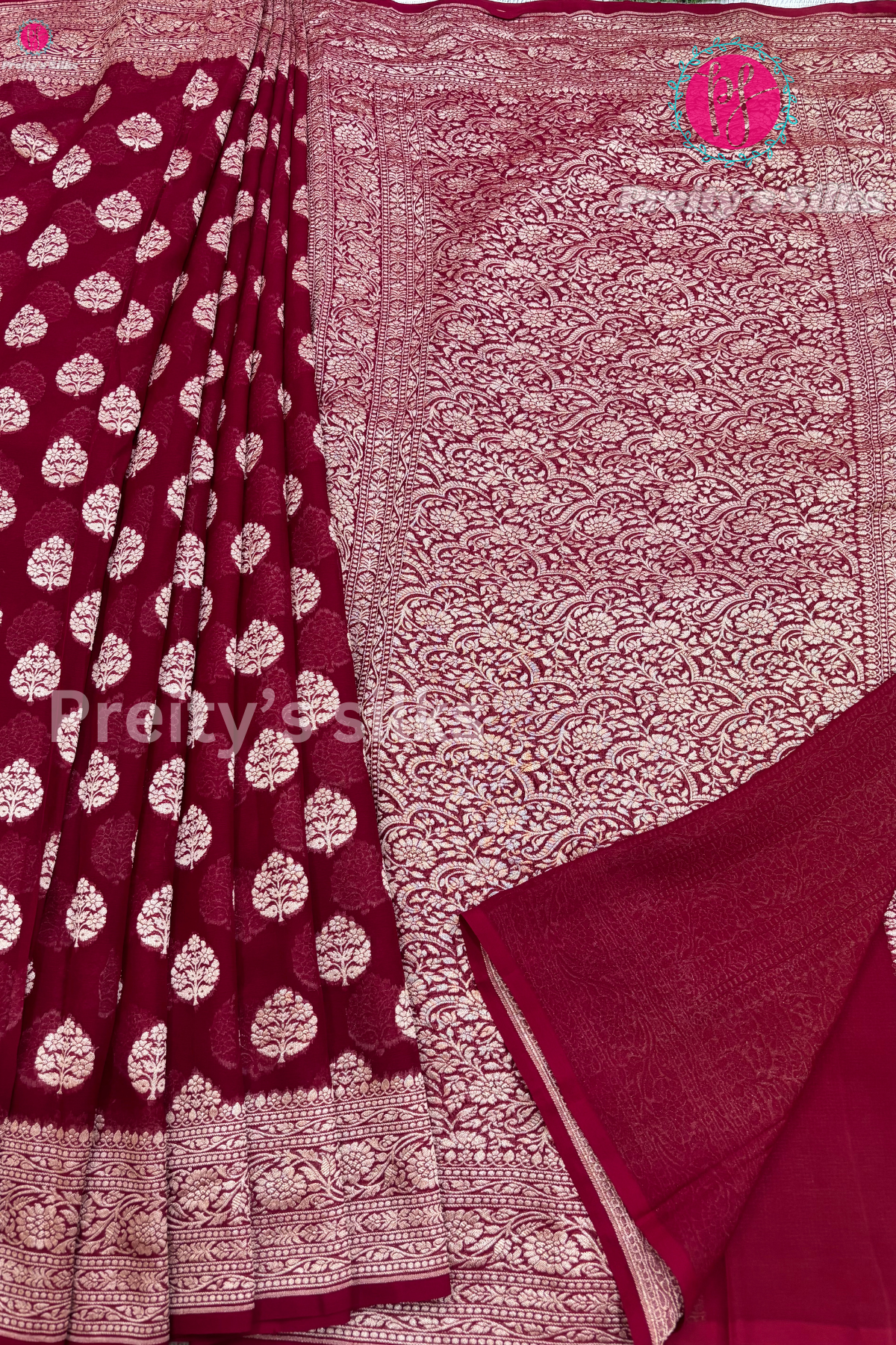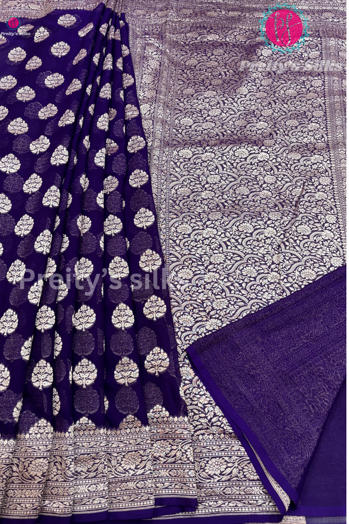 Design: Pure Khaddi Banarasi Georgette Silk Saree, beautifully crafted with antique zari work featuring delicate small motifs all over. Enhanced with a stunning colored border, a rich, intricately woven pallu, and paired with a brocade blouse for a truly regal and timeless appeal