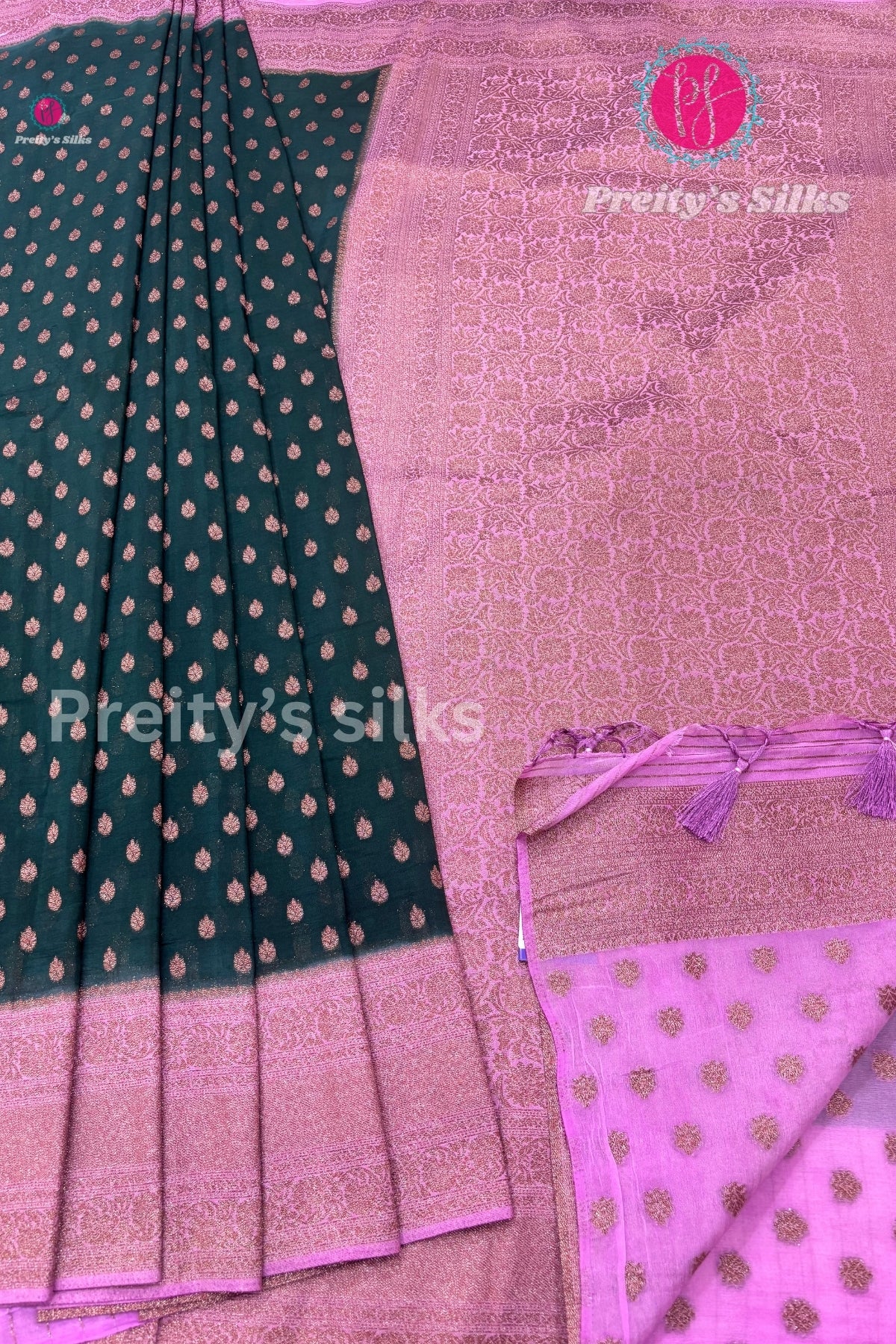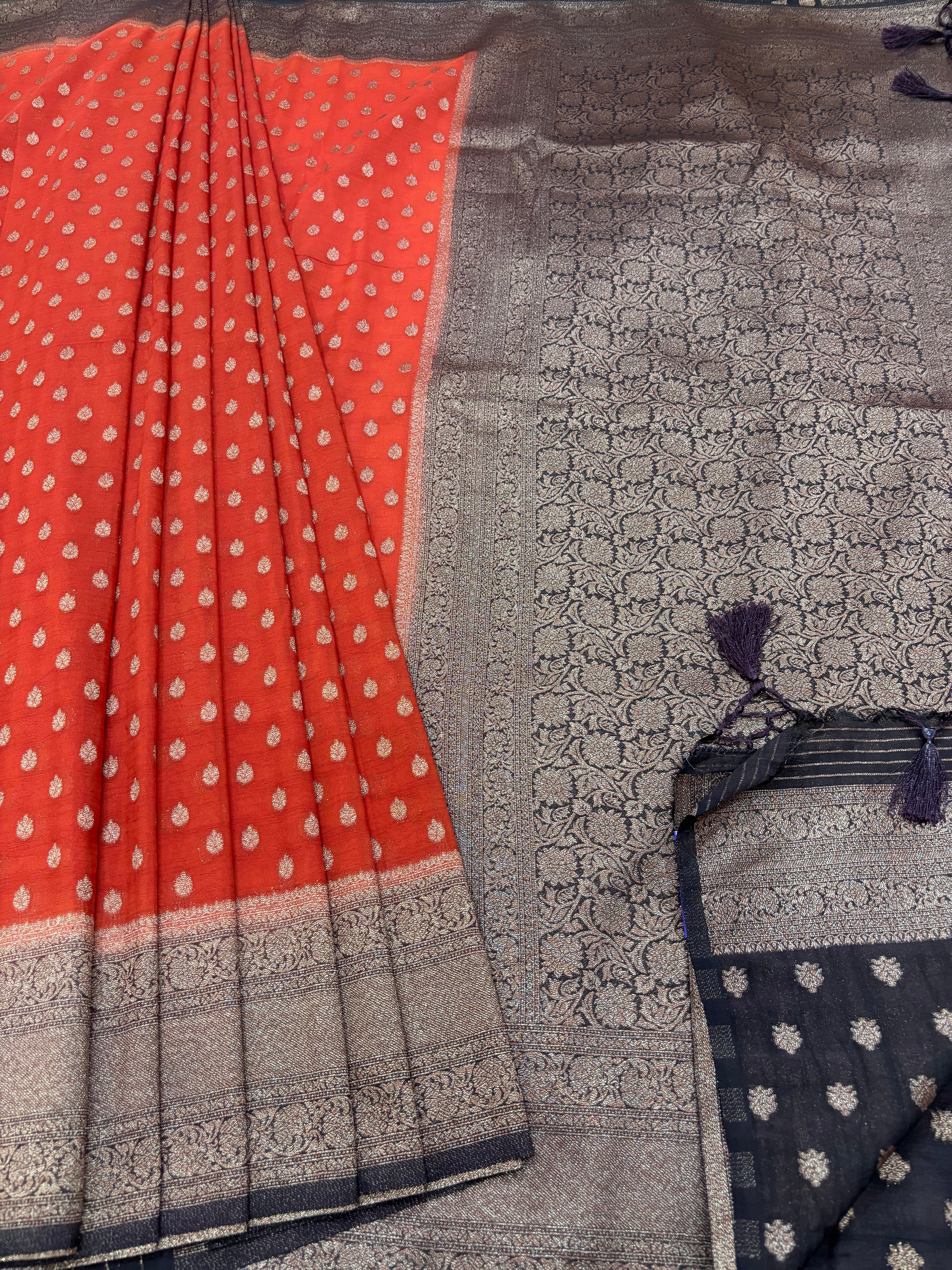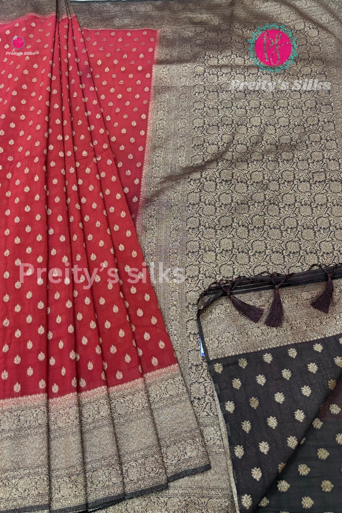 Design : This Banarasi Chiffon Silk Saree is a masterpiece of grace, combining the lightweight charm of chiffon with the richness of Banarasi weaving. The fabric flows effortlessly, giving a soft and elegant drape. Intricate motifs woven with fine zari enhance its beauty, making it a perfect choice for festive and celebratory occasions. A traditional border adds a regal touch, balancing delicacy with grandeur. Comfortable yet luxurious, this saree is ideal for those who love subtle elegance with a hint of tradition. Pair it with statement jewelry to complete the royal look.