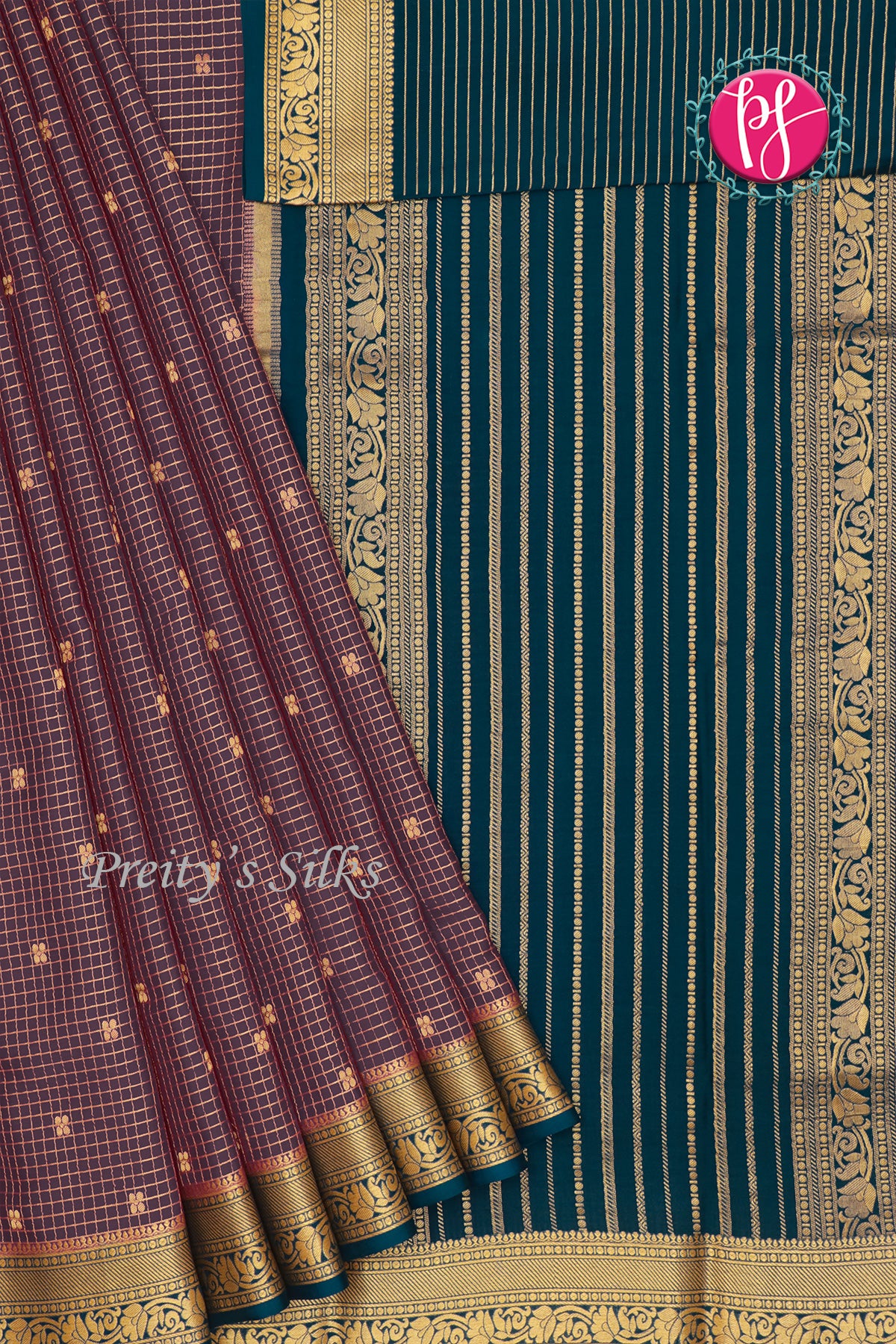 Grace meets elegance in this stunning Mysore crepe silk saree, featuring a beautiful blend of colors and intricate gold zari checks woven throughout. Adorned with elegant motifs and complemented by a rich, opulent pallu, this saree is perfect for any special occasion. Comes with a plain contrast blouse to complete the look.