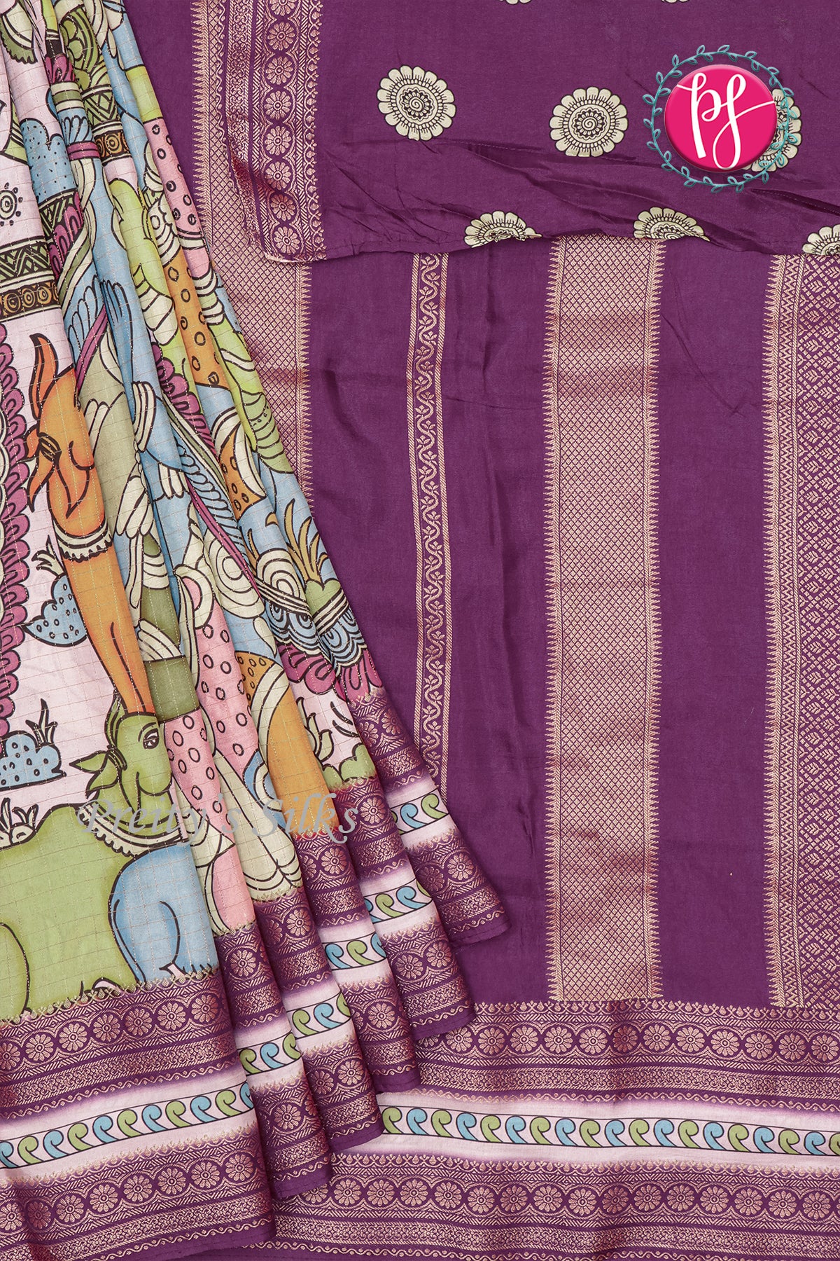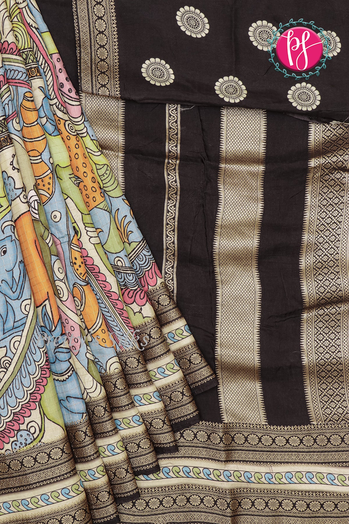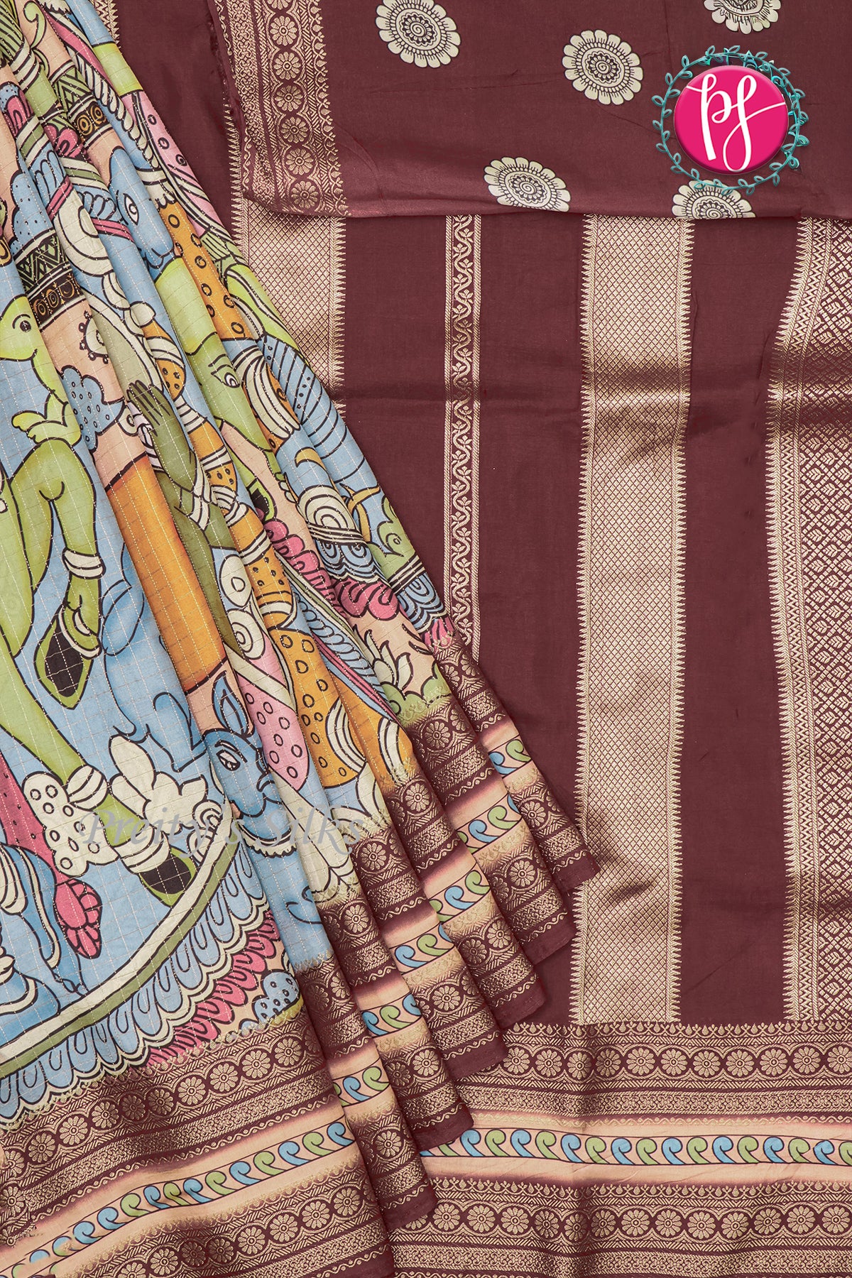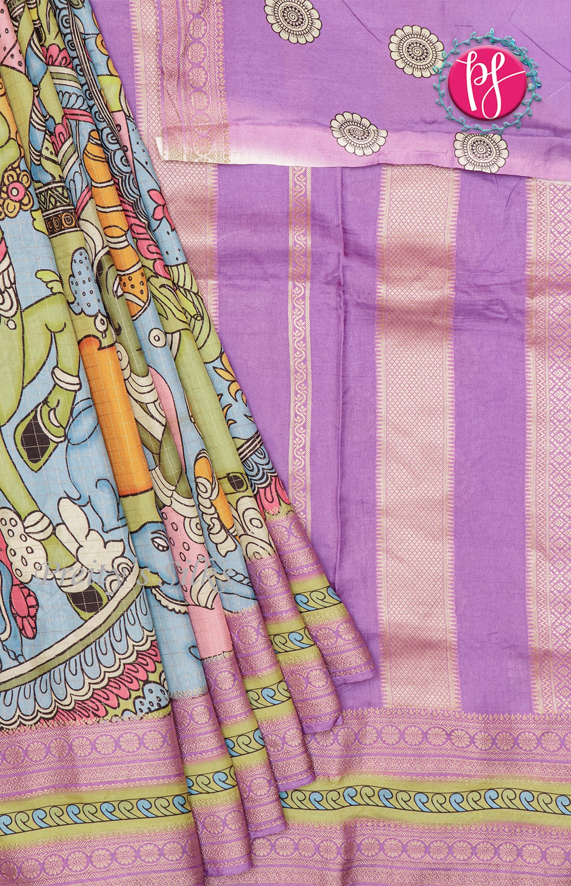 Product Description: This stunning saree is woven from premium Russian silk, known for its smooth texture and graceful fall. The subtle check pattern adds a modern touch while maintaining an elegant traditional vibe. Beautiful Kalamkari prints enhance the saree with artistic motifs and rich detailing. Lightweight and comfortable