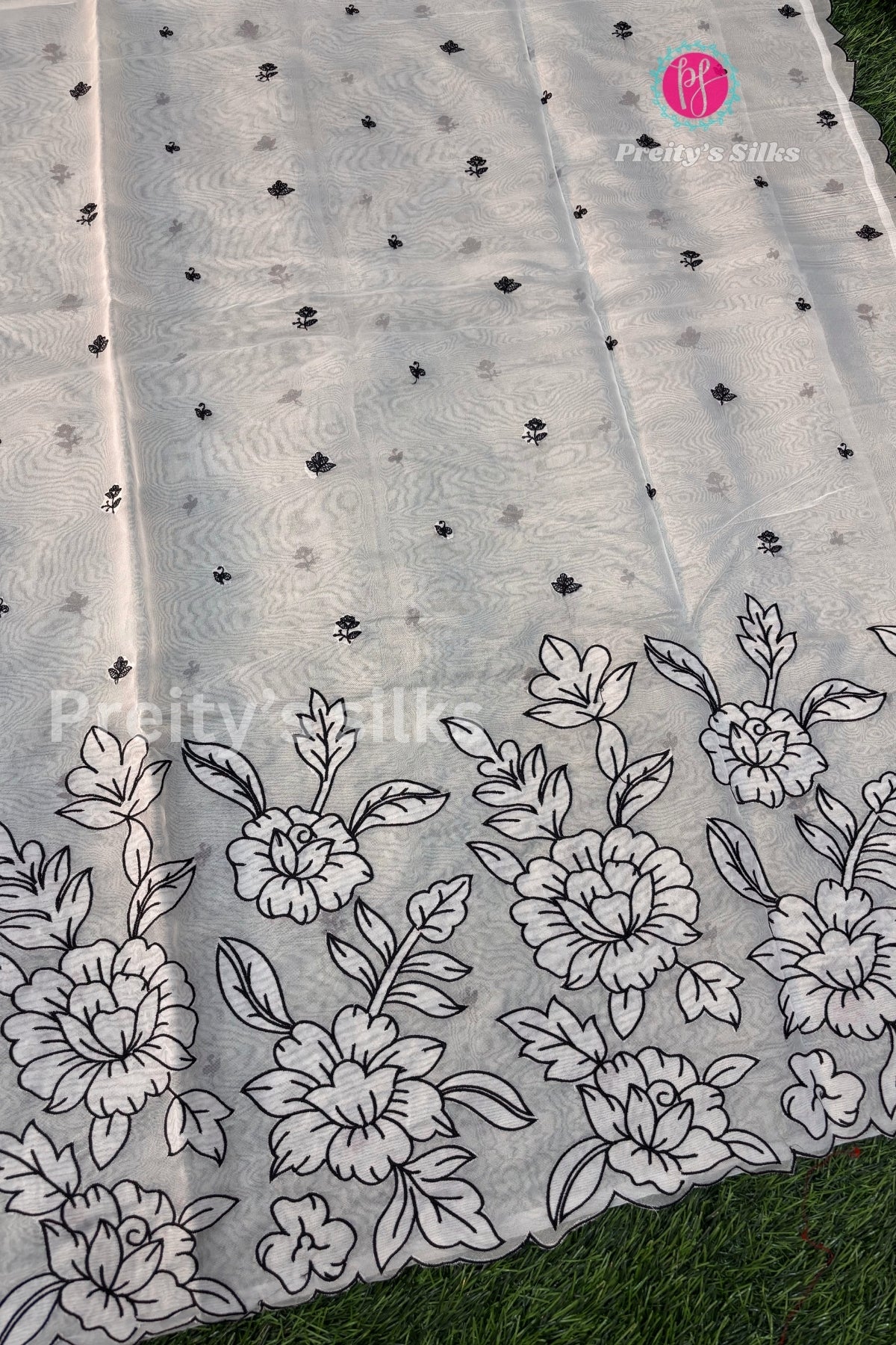 Organza silk with embroidery design - Half White with Black embroidery design-PF64748