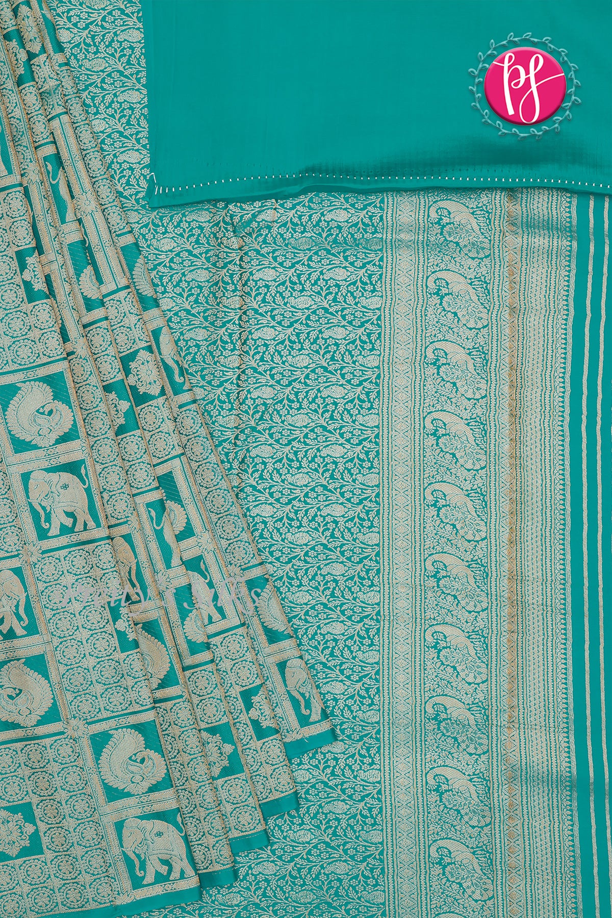 This elegant piece features a vibrant contrast of sea-green body with a royal blue pallu, adding a striking visual appeal.