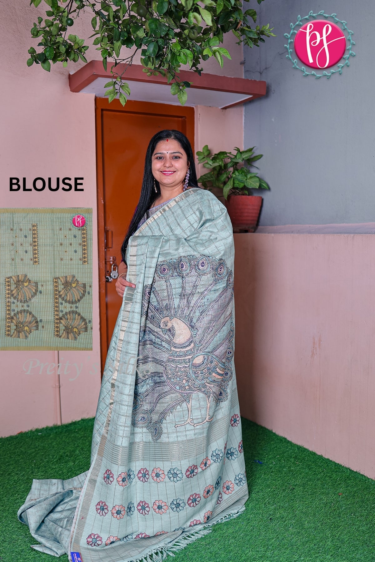 Product Description :This Tussar Dhupion saree showcases rich Kalamkari prints that reflect timeless Indian artistry.